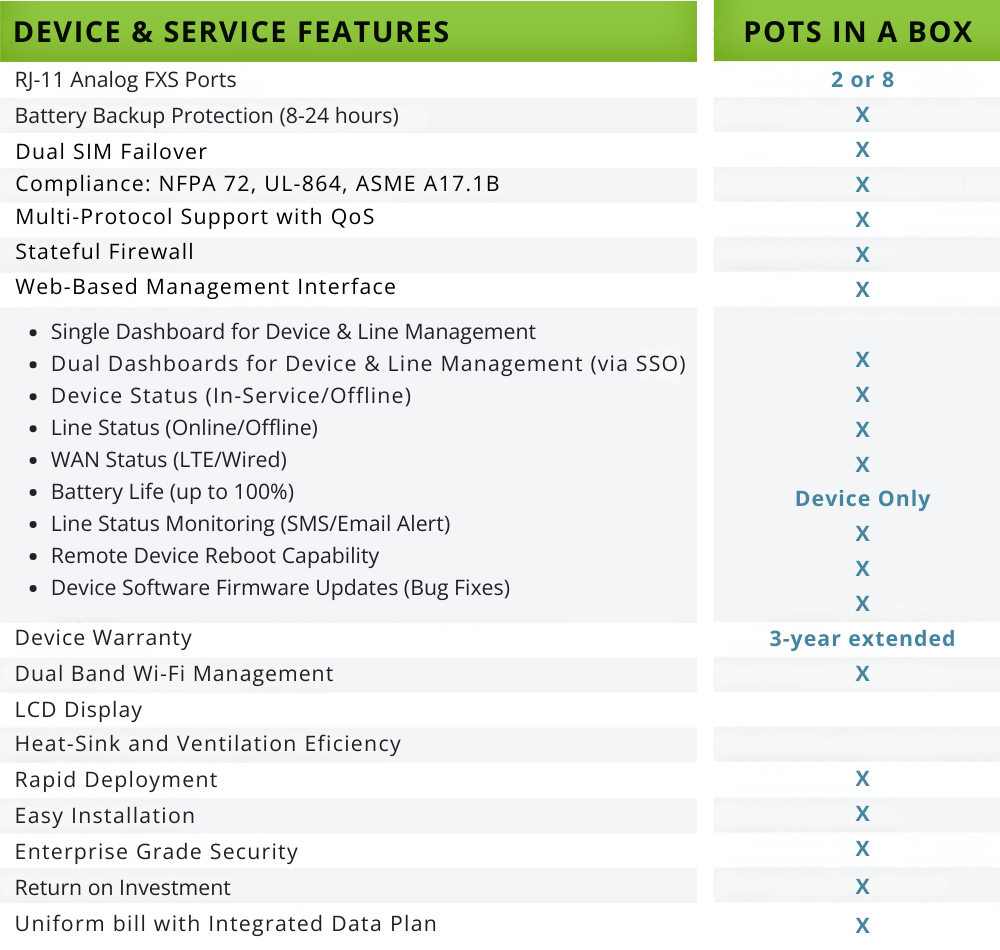 Our new POTS Transformation Box is a one-stop, cost effective solution to upgrade your legacy emergency lines to a modern digital connection. No matter the size of your business, our POTS Transformation Box will integrate your analog network with the digital world. That means you can continue to support all your existing services without needing to replace the entire system.